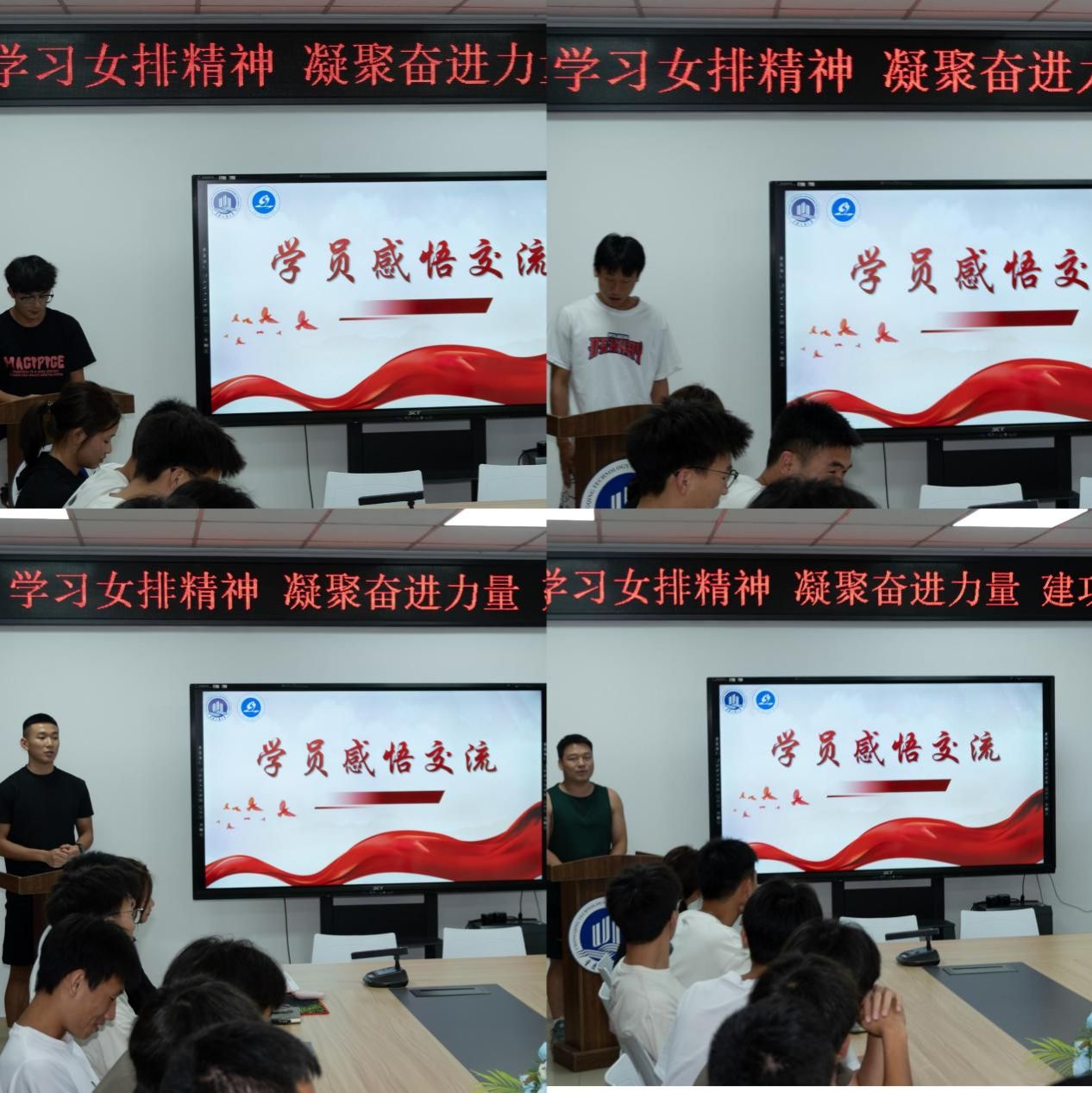 女排队员的分享深深触动了在场同学。四位来自不同年级和专业的学生代表踊跃发言,畅谈学习女排精神的感悟。他们的发言真挚热烈,充满了对女排精神的崇敬和将其融入自身成长的强烈意愿。