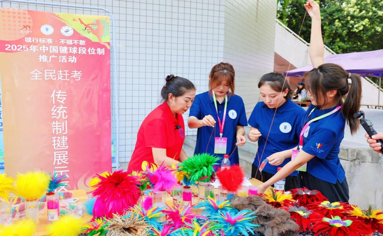 另外,比赛过程中还进行了毛毽传统制作技艺非遗展示,重庆市手工羽毛毽传统制作技艺市级代表性传承人李兴兰女士亲临现场,带领师生沉浸式解锁这一非遗项目的完整工序,学生们在传承人手把手的指导下,亲身参与“十余道工序造一毽”的创作过程,在指尖的操作里触摸到非遗技艺的匠心,也让这场活动的文化底色愈发厚重鲜活。